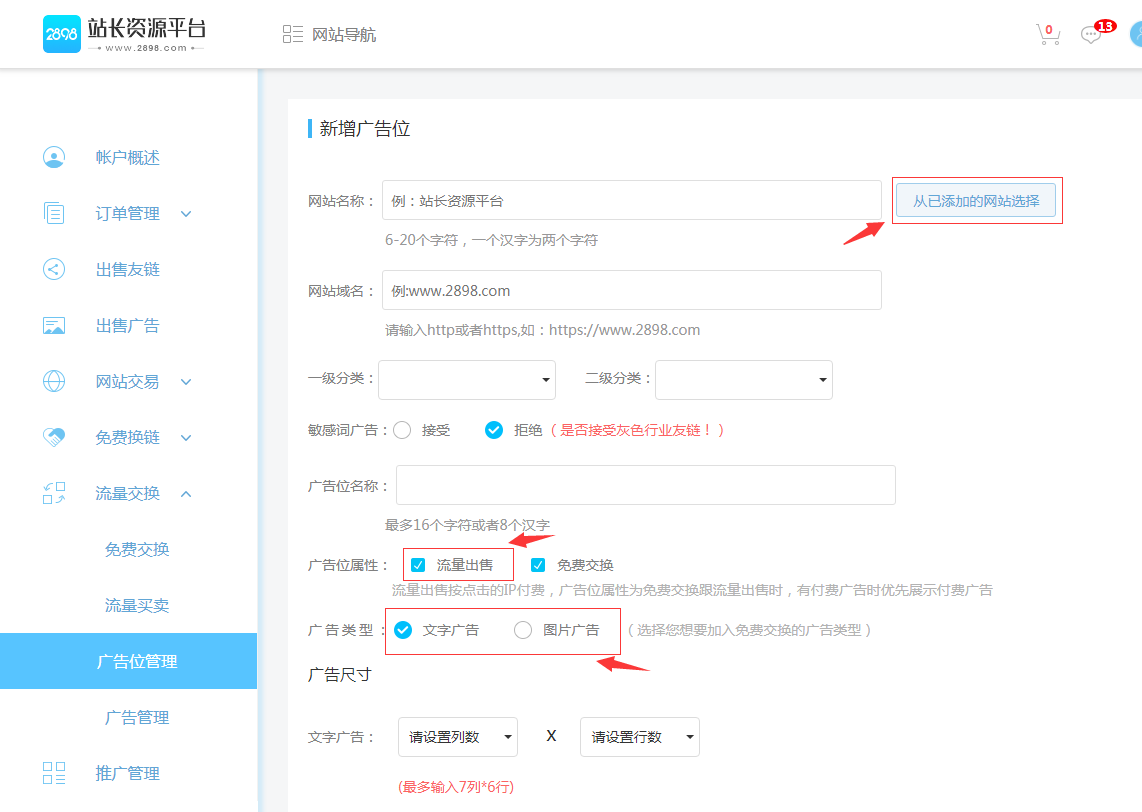 第二步:新增广告位-已添加的网站选择(如第一次添加可填写对应网站名称、网站域名、一级分类、二级分类),填写广告名称、广告位属性(流量出售为必选,默认流量出售、免费交换双选),广告类型(默认文字广告、图片广告)可根据自己网站所需要的广告尺寸选择而定-获取广告代码