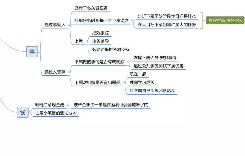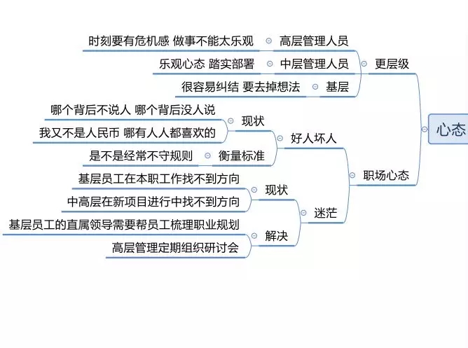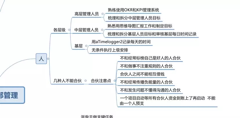 然后就是梳理和拆分中层管理人员的目标,管理人员其实最主要的一个任务就是拆分目标,管理目标,中层管理人员必须熟悉思维导图和用思维导图进行工作汇报。每一个中层管理人员工作汇报,集团要求必须是思维导图先提交到上一层级,然后上一份层级看完以后根据这个思维导图跟中层管理人员来谈话,然后来理顺这个事情。