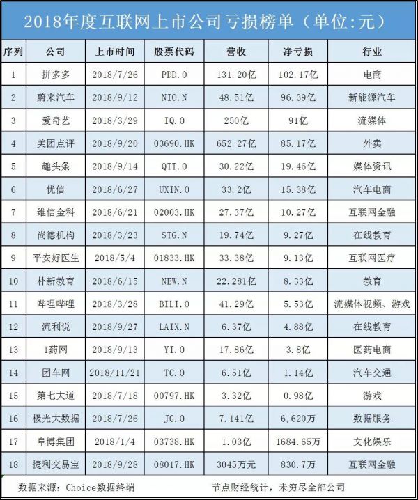 其中拼多多2018年净亏损102.17亿元居首,蔚来汽车净亏损96.39亿元排第二,爱奇艺净亏损91亿元排第三,美团点评净亏损85.17亿元排第四。