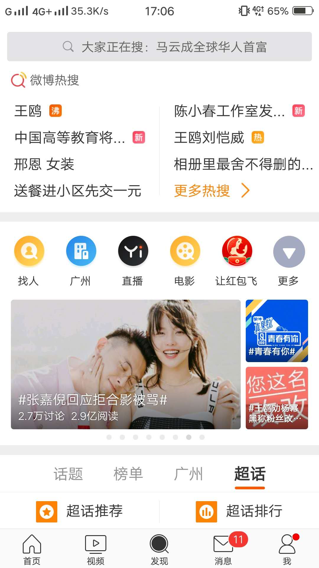 1、首先我们要说就是超话营销,大家可以先看下这张图,打开微博手机端,点击中间的发现,看到超话。