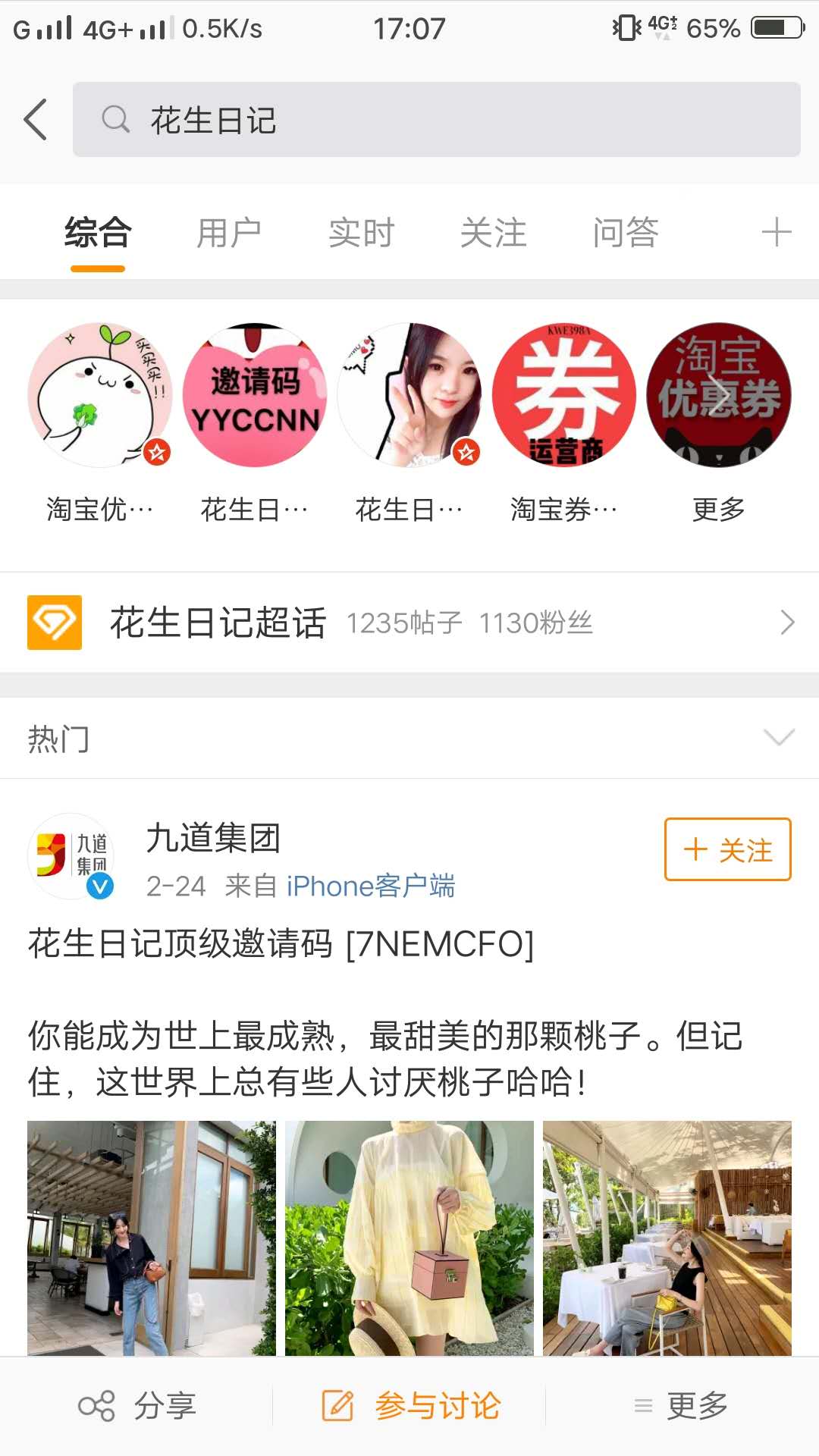 搜索相对应的关键词,例如花生日记,购物,网购,粉象生活,蜜源,高佣联盟,好省,赚钱联盟,淘粉网,更省等,想到跟网购有关的关键词都可以,这样比较精准,当然有人的地方就有市场,实在想不到也可以不用太精准,例如大学生超话这样的,因为网购人人都需要!(这里以花生日记为例,花生日记注册入口:注册链接)