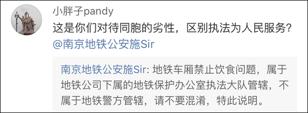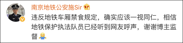 针对该网友发布的内容,南京地铁公安分局宣传民警“施sir”在当日23点54分首先进行了回应。施警官表示:行为违反地铁车厢禁食规定,确实应该一视同仁,相信地铁执法队员已经听到网友呼声,谢谢博主监督。