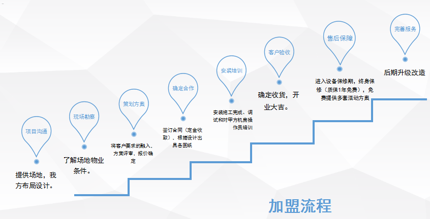 蓝泡泡儿童室内水上乐园加盟的流程可以分为这九步。水上乐园在经营的过程中,一定要注意保证安全问题,恒定水温系统一定要经常的检查避免出现漏电的情况,还有要提醒家长照顾好自己的孩子,配备水上救生员以及急救专家,通过这些细节来保证孩子的生命安全。