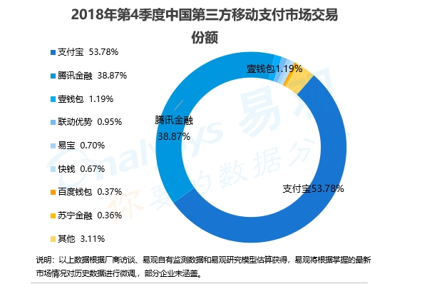 日前,独立第三方研究机构易观发布的《中国第三方支付移动支付市场季度监测报告2018年第4季度》数据显示,2018年第四季度,中国第三方支付移动支付市场交易规模达47.2万亿元人民币,环比升高7.78%。其中,支付宝以53.78%的市场份额继续夺得移动支付头名,且份额较三季度再度扩大8个基点。