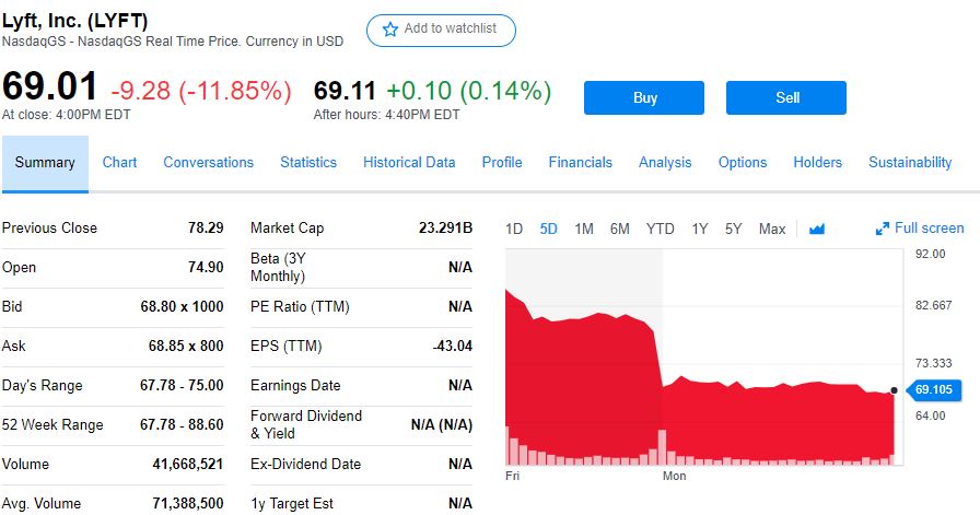 其中,Lyft上市第二日盘中最低跌至67.78美元,日内跌幅扩大至13.4%,较72美元的IPO发行价下跌5.9%,较IPO首日的历史最高88.60美元下跌23.5%,进入技术位熊市区间。最终收跌11.85%,报收69.01美元,较史高下跌22%,CNBC数据库统计的市值跌至196亿美元。