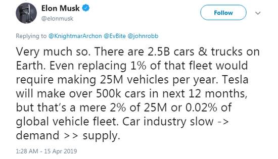 马斯克称全世界有25亿辆汽车,如果只替换其中1%,也需要生产2500万辆电动汽车,而其计划生产量也只是达到了全球汽车总量的0.02%。