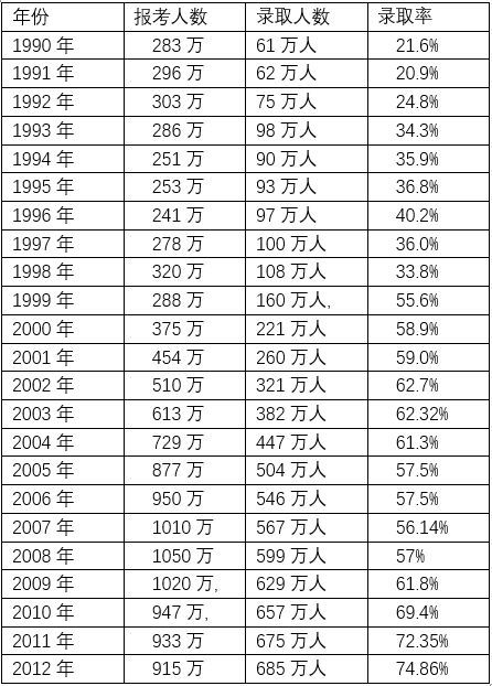 1990-2012年全国普通高校招生人数、录取人数及录取率: