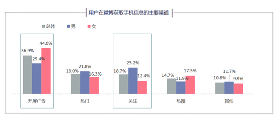 厂商新机发布前的微博内容营销会促进用户关注并购买新品,小米在此方面表现更好,参与话题用户中购买对应新机比例达到7.2%。针对微博用户获取手机品牌信息的调研则显示,女性用户主要从开屏广告获取信息,男性用户更多从开屏广告和关注流获取相关信息。