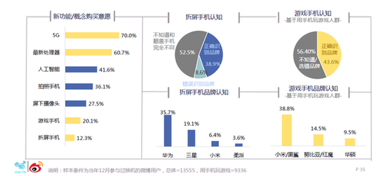 针对手机新功能以及新概念的购买意愿来看,5G技术不出所料以70%的意愿度成为最吸引用户的指标,被热炒的折屏概念仅仅有12.3%的意愿度。而对于折屏手机的认知而言,有超50%用户不知折屏和翻盖手机完全不同。