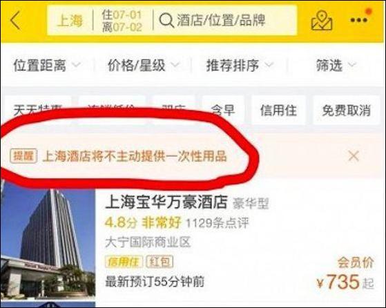 我们可以在各大酒店类app,包括艺龙在内的多家在线旅游网站目前均在订房页面提示,7月1日起,上海旅游住宿业将不再主动提供牙刷等一次性日用品。