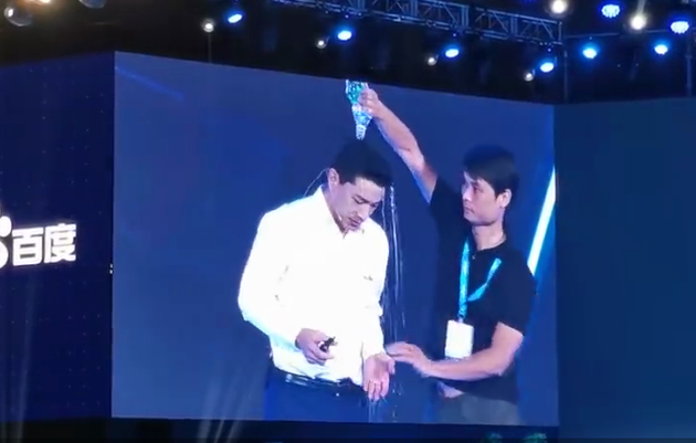 新浪科技讯 7月3日上午消息,2019年百度AI开发者大会今日举行,现场百度CEO李彦宏演讲开场。演讲过程中,突然有观众冲上演讲台向李彦宏头部倒了一瓶水。不过李彦宏淡定化解。