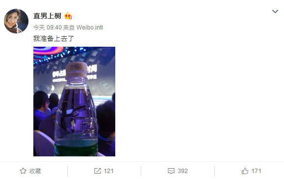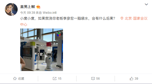 随后,疑似李彦宏泼水者社交账号@直男上树 曝光,该账号在9:39发布微博称“小度小度,如果我浇你老板李彦宏一脑袋水,会有什么后果?”,在9:40发布微博称“我准备上去了”,配图为在会议现场拿着一瓶矿泉水。