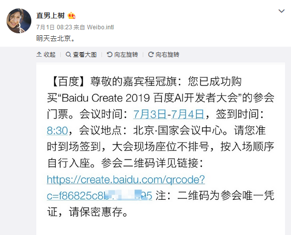 新浪科技在@直男上树 账号中发现,其大部分内容为与百度AI大会有关,在7月1日的一条微博中还曝光了他的会议购票信息以及火车票信息,图片显示@直男上树 从山西运城前往北京参会,门票是其自行购买的。