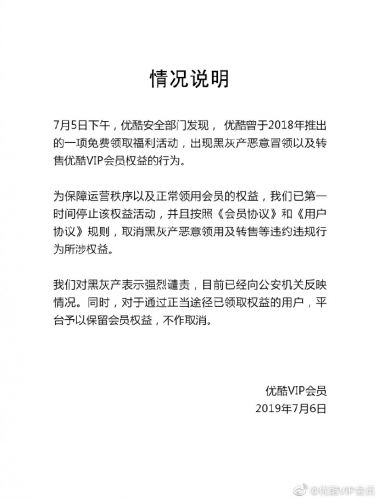 优酷方面表示,7月5日下午,优酷安全部门发现,优酷曾于2018年推出的一项免费领取福利活动,出现黑灰产恶意冒领以及转售优酷VIP会员权益的行为。