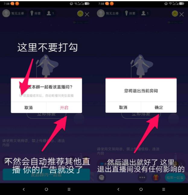 第六步:图上的箭头所示,这里不要大狗,不然会自动推荐其他直播,你的广告就没了,然后退出就好了,这里退出直播间没有任何影响的。