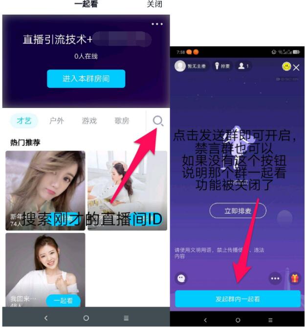 第五步:搜索刚才直播间的ID,点击发送群即可开启,如果没有这个按钮说明那个群的“一起看”按钮被关了。
