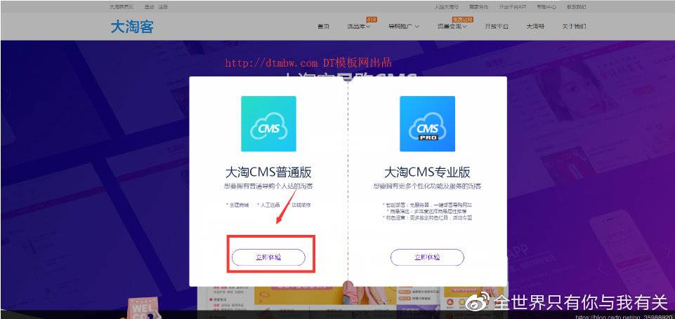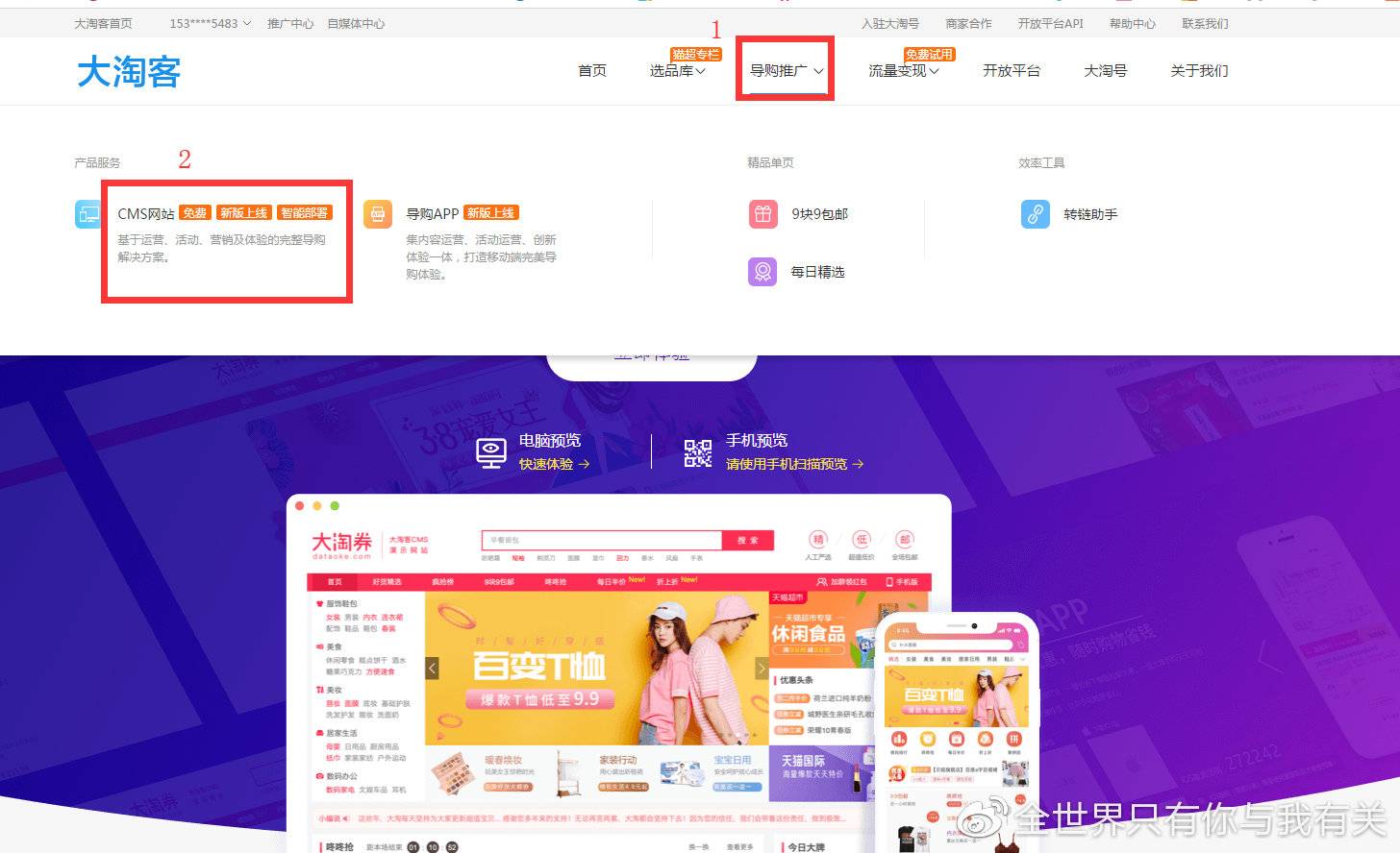 进入大淘客官网,登录后,导购推广》找到 CMS网站,》点击立即体验