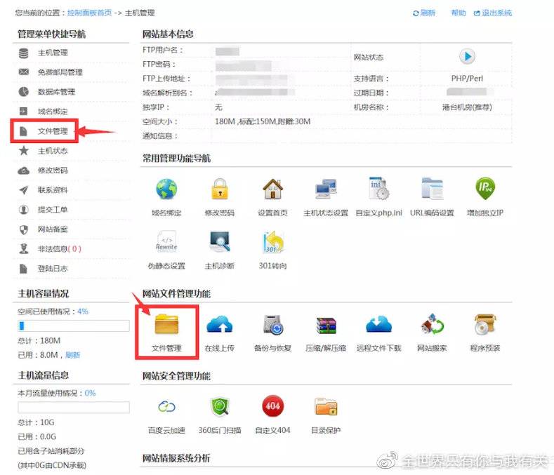 回到九州数码管理中心,找到虚拟主机管理-管理-进入高级管理 - 到主机控制面板,找到文件管理