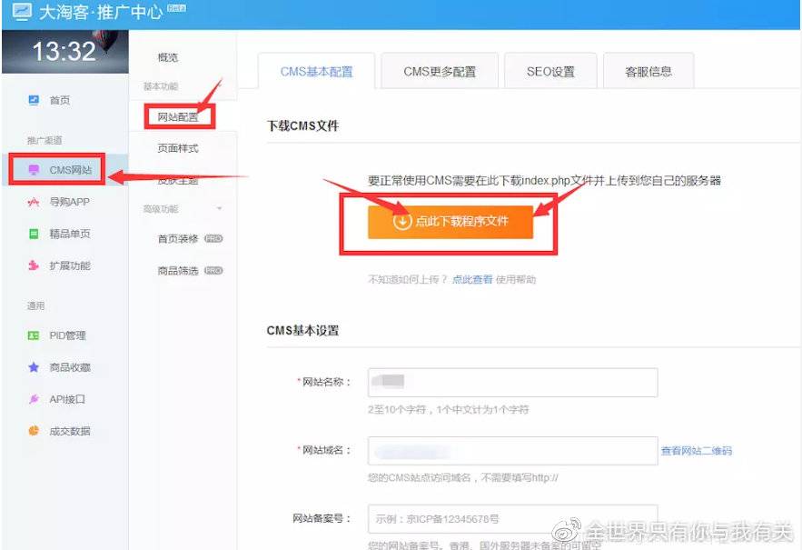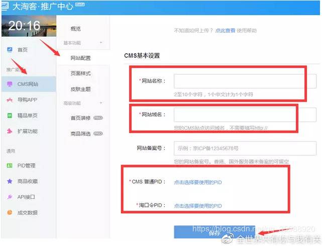 授权成功后,在CMS网站-网站设置,设置好网站名称、网站域名、选择要使用的PID保存即可