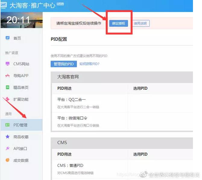 在推广中心点击左侧的PID管理,上面有个绑定授权,。登陆淘宝联盟账号绑定