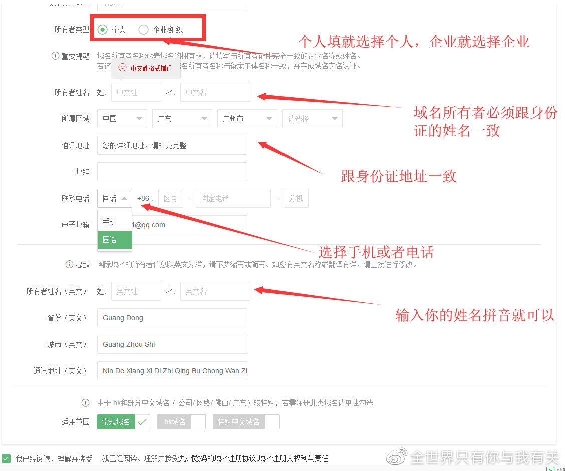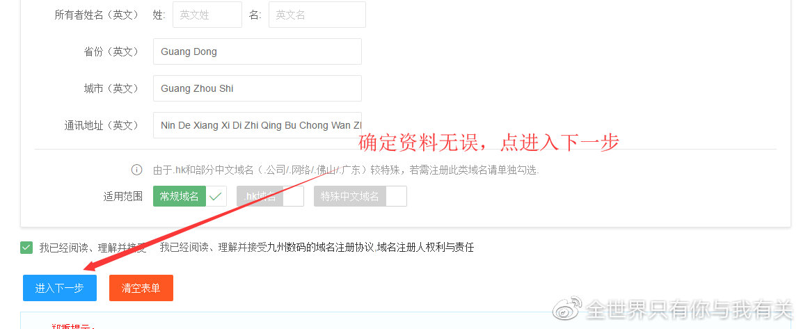 域名信息一定要认真填写,姓名一定要填跟身份证的一致否则实名认证会失败。电话号码跟传真没有的话可以填手机号码就可以。填好信息后下面的都打钩然后进入下一步