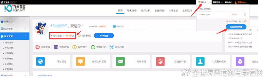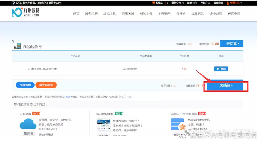 点击去结算,结算后到管理中心–域名管理 看下是否有您注册的域名