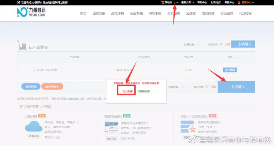 账号已经充值成功,现在把鼠标移动到顶部的购物车点击去购物车结算