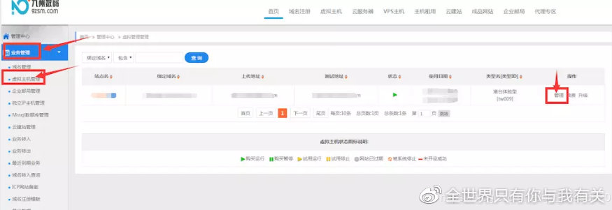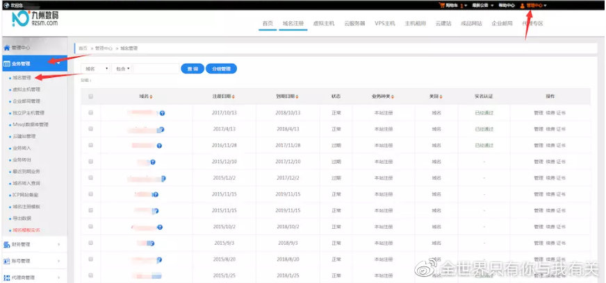 管理中心》业务管理》 域名管理》 然后就可以看到你注册的所有域名