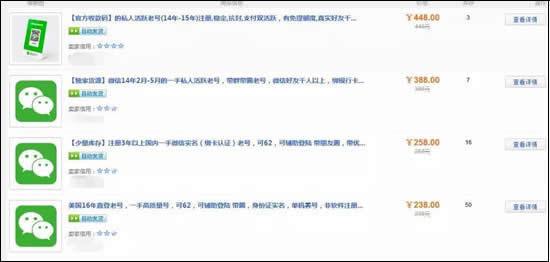 而这种资料、功能越完善,注册时间越长,越不容易被封的微信号价格都能上百。所以就单个微信号的价值来看,每个微信号都值10几元到几百元不等。