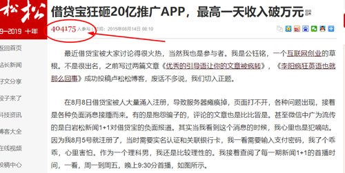 当时,我清晰的记得不少公司的推广员,在百度搜索,“如何推广借贷宝”,然后发现了松松博客上的一篇文章,可以查看下“借贷宝狂砸20亿推广APP,最高一天收入破万元”这篇文章的地址。因为这个文章,让我算是小赚了一笔,时间最短,却实际上收益最大的,一笔财富,当然肯定比我赚的多的人,大有人在。