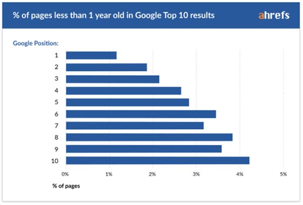 可以看到,排到第一的页面中只有1%多一点是1年以下的新页面,排到第10的也只有4%是1年的新页面。