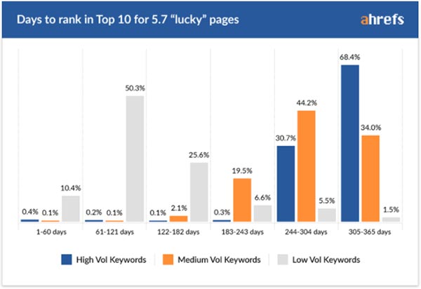 ahrefs在2017年2月发布了一个帖子:多久才能在Google获得排名?简要介绍一下主要数据。