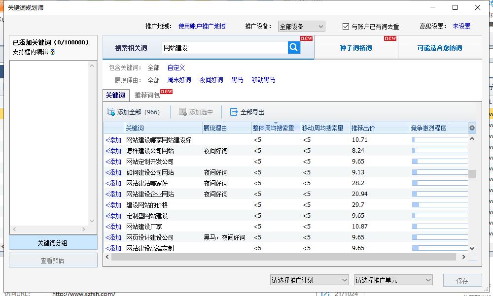 如果有百度竞价的帐号那就更好了,登录百度推广客户端,选择添加关键词,输入相关的关键词,就会出来很多相关的词语,还可以看到PC周搜索量跟移动周搜索量,这时候我们只要挑选<50的关键词,这样也能获得很多关键词,这个工具中还会出现<5的关键词,我个人觉得这个关键词也是可以的,因为一周5个,一个月20个人搜索,100个词的话就是2000的搜索量了。