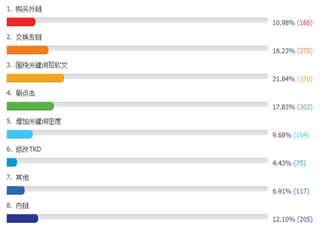 经常可以看到群里论坛里会有人在讨论,网站排名在第二页或者第三页就是上不了首页,针对这类情况,可以说各种SEOER都有各种手段来优化,那么小编看到了这么一份统计,大致给大家说说,SEOER用的都是哪些秘籍。