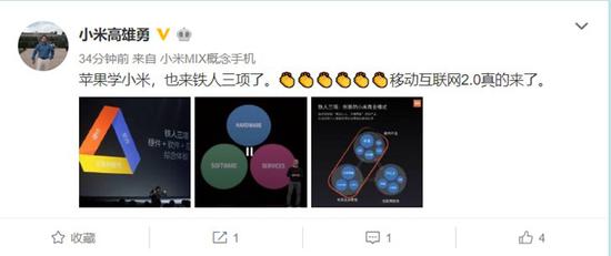 今日早间,小米电视营销副总裁高雄勇发文称,苹果学小米,也来铁人三项了,并表示移动互联网2.0真的来了。