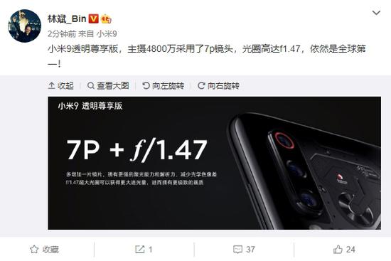 “小米9透明尊享版,主摄4800万采用了7p镜头,光圈高达f1.47,依然是全球第一! ”