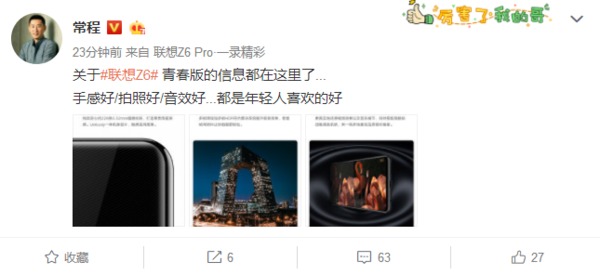 4月23日,联想在北京正式推出了新一代旗舰新机Z6 Pro,而在本月初,联想官方还宣布近期将推出另外一款新机——联想Z6青春版。现在有最新消息,联想总裁常程近日在微博晒出了该机的更多关键细节。