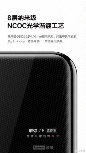 根据常程透露的消息,这款联想Z6青春版目标定位为年轻群体,并称赞该机“手感好、拍照好、音效好”。从他晒出的三张海报来看,在外观方面,联想Z6青春版将采用8层纳米级NCOC光学渐镀工艺,使用0.2mm镭雕纹路技术,并采用Unibody一一体机身设计,触感温润顺滑。