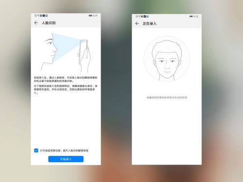 前期操作步骤完成后,正式进入到人脸设置界面,用前置镜头对准自己,摄像头会自动录入人脸数据。最好正视镜头,尽可能在室外或者室内光线充足的环境下录入人脸。