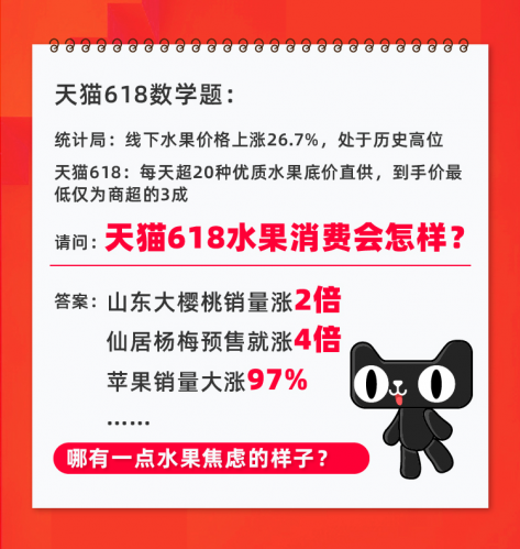 近日国家统计局称,当前线下水果价格处于历史高位,同比上涨26.7%。但在天猫618,每天有20多种优质水果底价上市,到手价最低仅为线下商超的3成。有网友计算,如果通过天猫618来实现此前专家建议的“每天吃够半斤水果”,一周只要花22块5毛钱。完全“吃得起”。优质优价之下,天猫618水果销量全线翻番。