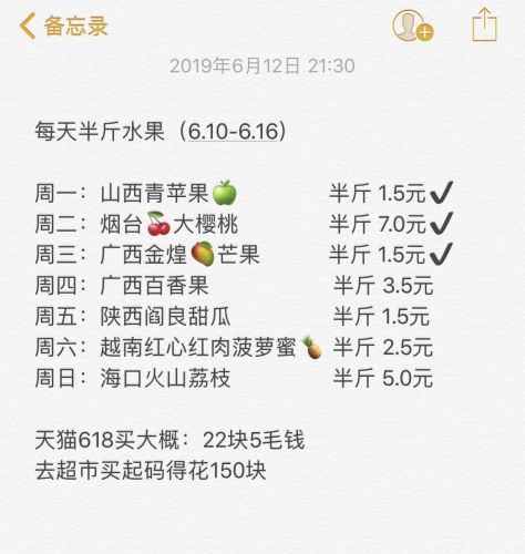 图/网友晒出自己的“每天半斤水果”计划,发现:要实现专家的建议,通过天猫618买水果,每周只要花22块5毛钱