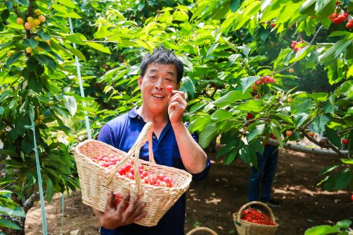 图/在烟台九岭夼村,果农抱着刚摘的山东大樱桃喜笑颜开