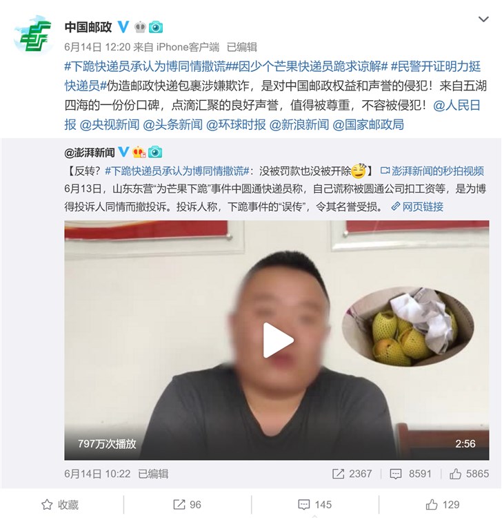 但随后事件出现新的动向,据澎湃新闻报道,6月13日,山东东营“为芒果下跪”事件中圆通快递员称,自己谎称被圆通公司扣工资等,是为博得投诉人同情而撤投诉。投诉人称,下跪事件的“误传”,令其名誉受损。