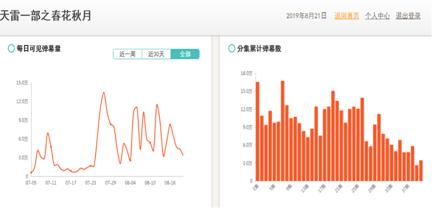 值得一提的是,骨朵报告显示,暑期档弹幕数超过350万的网剧共有4部,优酷独占2部。除《长安十二时辰》外,小成本黑马剧《天雷一部之春花秋月》以377万弹幕数排名第二,仅次于《陈情令》,并且每集弹幕数相对平均,足见这部圈层作品的用户粘性。