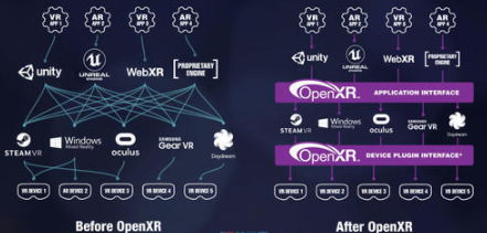 OpenXR包含一组抽象,可允许XR硬件平台供应商公开Runtime运行时系统的功能。通过在应用程序生命周期,渲染,追踪,帧定时和输入中采用一组通用的对象和函数,软件开发者的应用程序只需最少量的移植工作即可兼容多个XR系统,而这将能显著降低行业的碎片化现象。这意味着,例如,OpenXR可以使三星Gear VR、Oculus和Steam VR设备在同一个应用程序中更容易地得到支持。