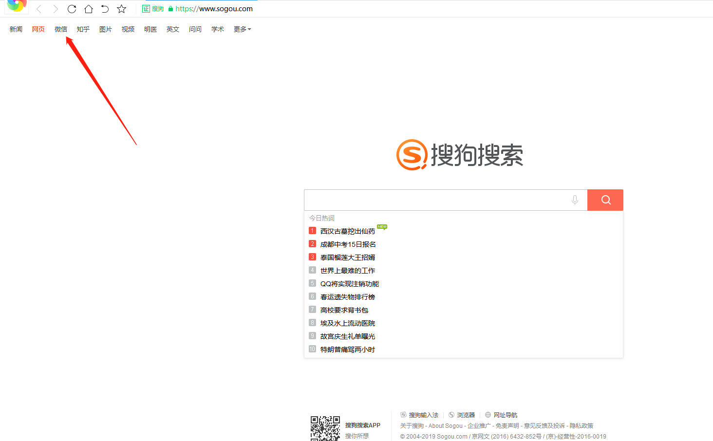 3、最后一个引流入口就是“搜狗搜索”,腾讯和搜狗的关系非常密切,虽然说搜狗比较出名的是输入法,但是它的搜索引擎也是有一定的流量,有些手机的浏览器跳转的就是搜狗搜索的页面。这里边有两个跟微信公众号有关的流量入口,一个就是首页左上角的微信,点击之后跳转的就是公众号和文章的搜索,这里就不截图了,自行去看一下。