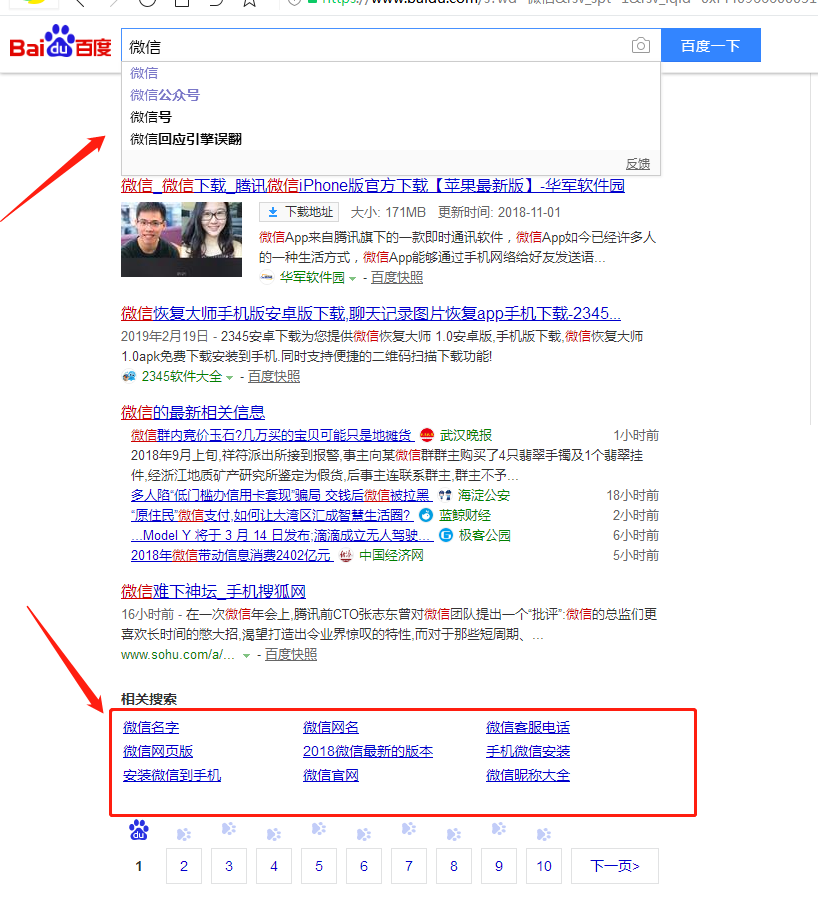 4、找长尾关键词(长尾关键词的意思就是你推广的项目或者产品延伸出来的关键词,如“微信”延伸出来的“微信公众号”,“微信app”等)如果你想不出来没关系,我们就去找,例如去百度或者其他搜索引擎搜索一下,如图搜索“微信”这个关键词的时候,下拉框和相关搜索会弹出相关的长尾关键词,直接拿过来用就可以,这些都是大家搜得比较多的,当然如果你想更加精准的话,可以去微信“搜一搜”获取长尾关键词: