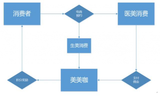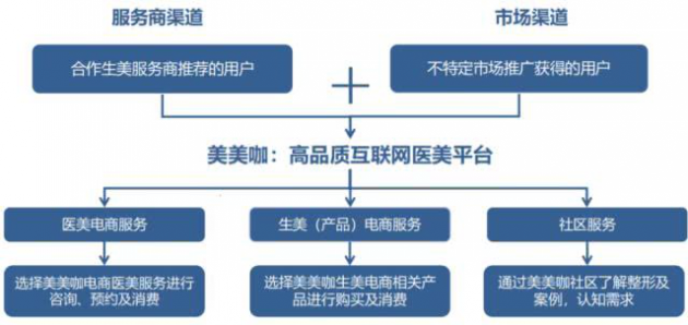 美美咖是一个开放的高品质医美电商平台,美美咖平台的所有消费用户除了代理商渠道推荐之外,美美咖还通过市场推广(如大姨妈app、芒果app、广告)获得了大量用户,自身具备完整的用户获取与消费转化能力。