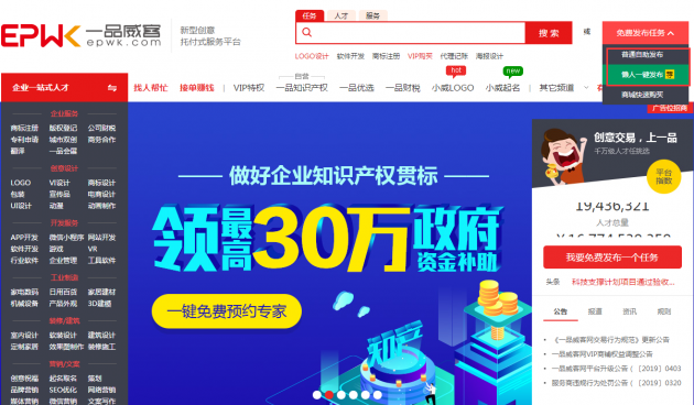 您可以点击一品威客网(http://www.epwk.com)首页搜索框右侧“免费发布任务”按钮,可以选择普通自助发布和懒人一键发布两种方式。