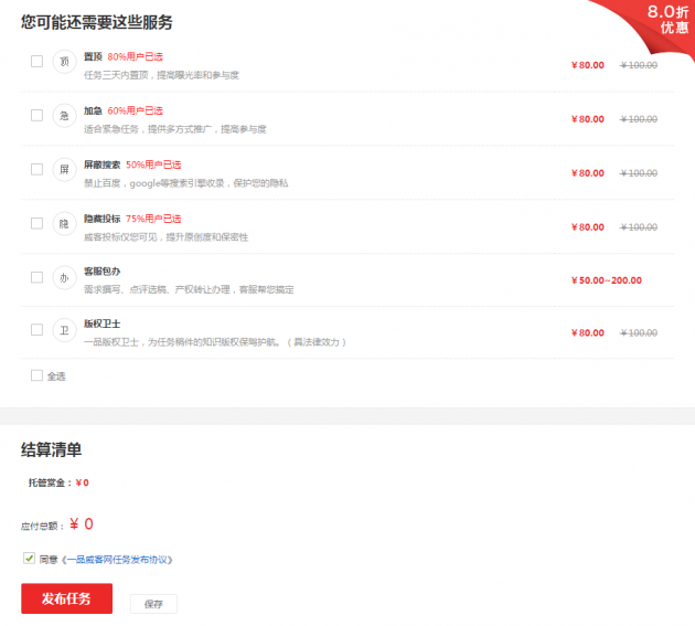 选择是否购买其它的增值服务,点击“发布任务”按钮。